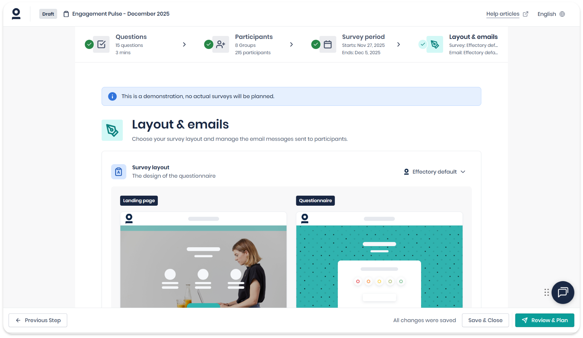 Der letzte Schritt bei der Erstellung Ihrer Befragung besteht darin, das Layout für Ihre Befragung und E-Mails auszuwählen sowie den Text Ihrer Einladung und Erinnerungen zu bearbeiten. Dadurch setzen Sie den richtigen Ton und schaffen einen professionellen Look für Ihre Teilnehmenden.