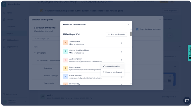Koordinator:innen können Befragungseinladungen direkt von der Befragungsseite aus in My Effectory erneut senden. Das ist nützlich, wenn ein:e Teilnehmende:r die ursprüngliche E-Mail verloren hat oder eine neue Einladung benötigt.