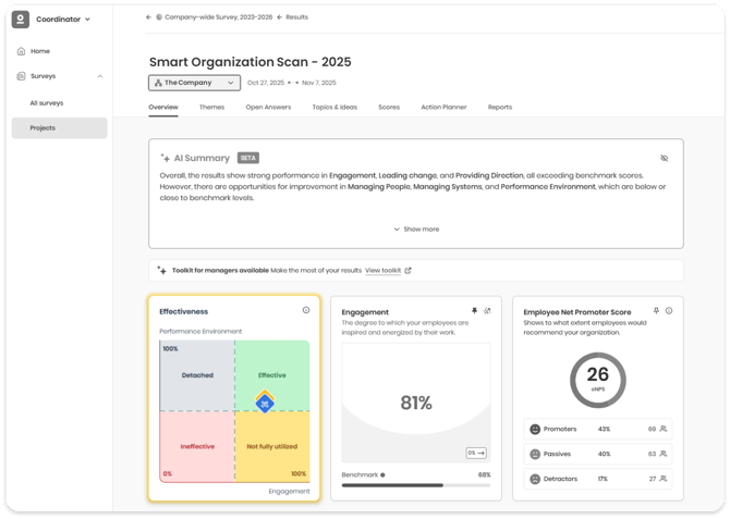 Sie finden die Matrix auf der Übersichtsseite des Ergebnis-Dashboards. Sie ist nur verfügbar, wenn Ihre Befragung die erforderlichen Fragen aus den Indizes „Engagement“ und „Qualität des Leistungsumfeldes“ enthält, die zur Berechnung des Effektivitäts-Ergebnisses nötig sind.