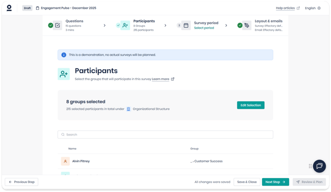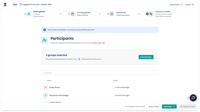 Wenn Sie eine Befragung in My Effectory erstellen, ist der erste Schritt die Auswahl der richtigen Teilnehmenden. Dadurch erhalten die richtigen Teams und Gruppen die Einladung zur Befragung erhalten und es wird gewährleistet, dass die Ergebnisse korrekt berichtet werden.