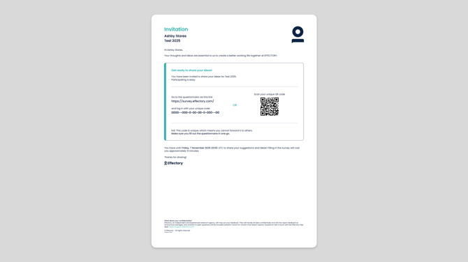 Für Teilnehmende:r ohne E-Mail-Adresse erstellt My Effectory automatisch Einladungen zum Ausdrucken, die Sie als PDFs herunterladen können. Jede Einladung enthält: