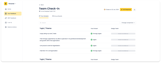 If you reopen a survey but do not submit it again before the survey closes, your response will not be included in the final survey results for your team and for the organization as a whole. To make sure your feedback counts, always click Submit after making changes.