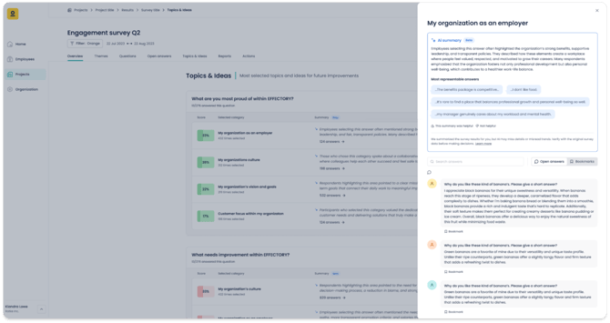 The Topics & ideas tab helps you see which themes matter most to your employees. It combines both quantitative and qualitative feedback, showing not only what employees are proud of or want to improve, but also why. This helps you identify recurring themes and turn insights into action.