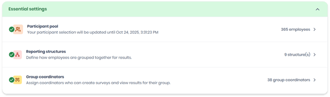 Reporting structures: Define how your organisation is grouped for results. Every project needs at least one structure. You can set it up after importing employee data or during project setup. Learn more about reporting structures here.