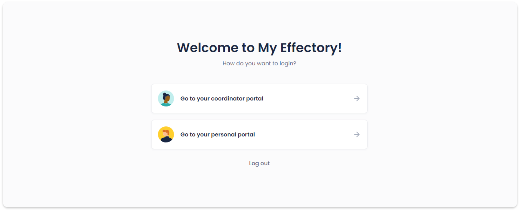 Wanneer je inlogt op My Effectory, krijg je de keuze tussen het Coördinator- en het Persoonlijk Portaal. Als je slechts toegang hebt tot één portaal, word je automatisch naar die omgeving geleid.