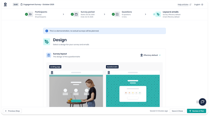The final step in creating your survey is choosing the layout for your survey and emails, and editing the text of your invitation and reminders. This helps you set the right tone and create a professional look for participants.