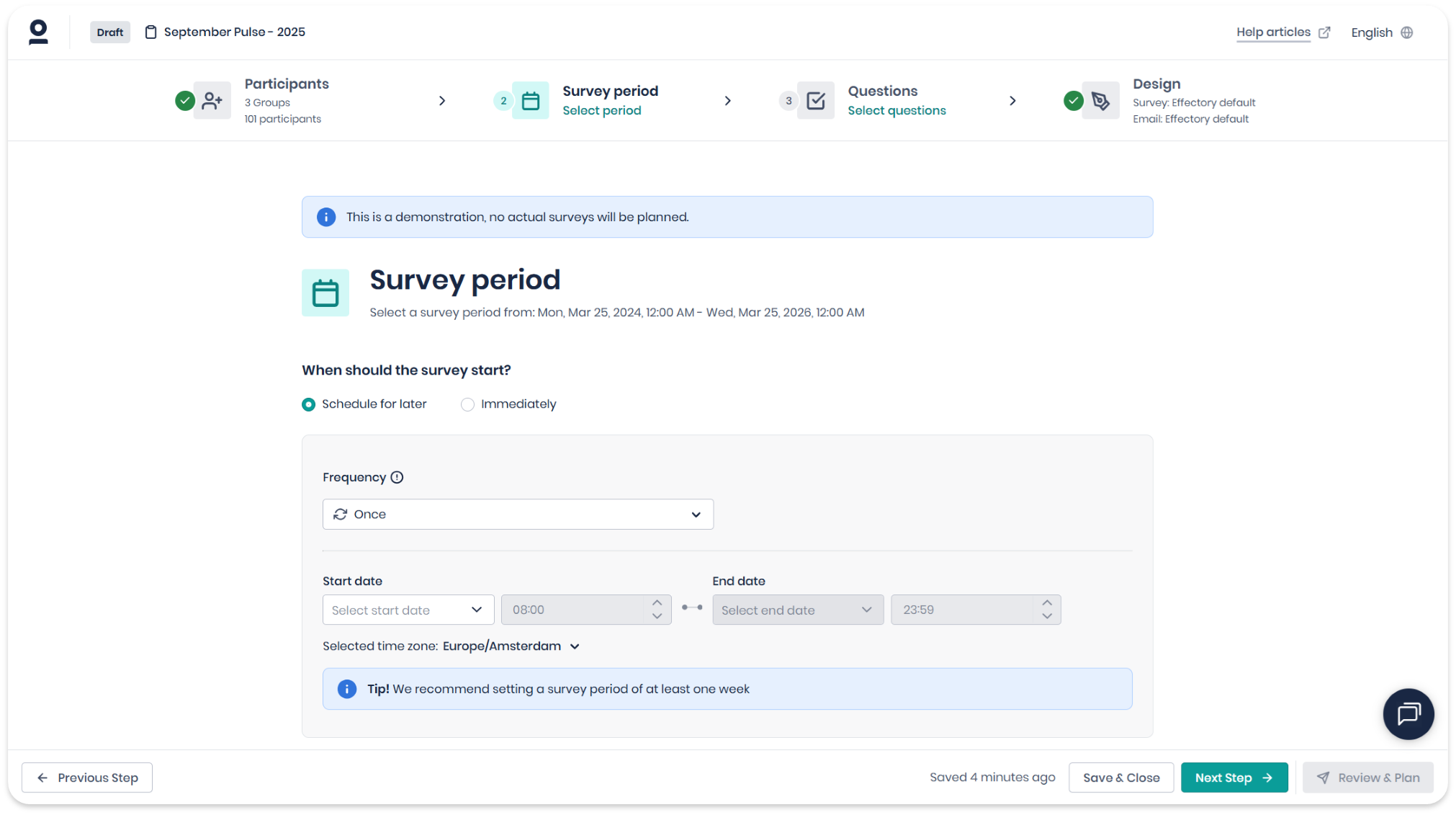 The survey period defines when your survey is available for participants. In this step, you can determine the survey start and closing date, as well as whether it should be sent once or on a recurring basis.